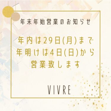 メリークリスマス🎄 今年もあと少しですね。VIVREは年末に向けて、髪も気分も整えるお手伝いをしています。 今年もたくさんの皆様からご来店をいただけたことに感謝しております。 年内は29日(月)まで、年明けは1/4(日)から営業します。 大変申し訳あ […]